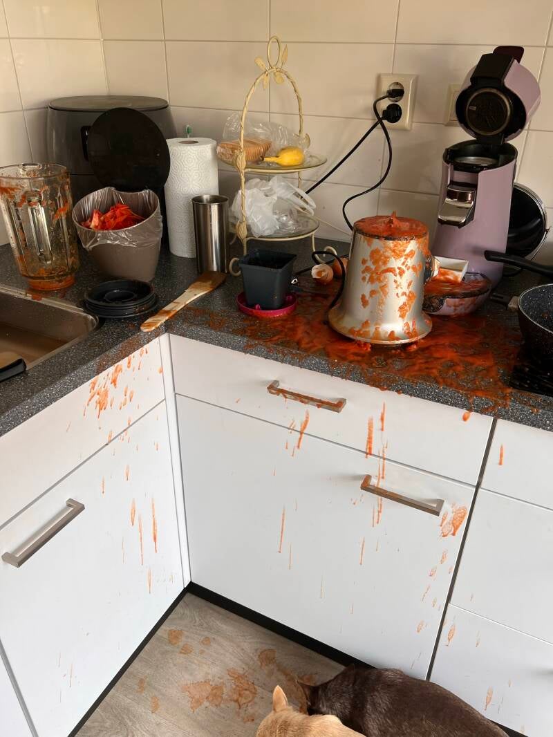 Zelfgemaakte tomatensaus liep in de soep ... pff wat een troep. mijn hele keuken zat onder ... foutje ...